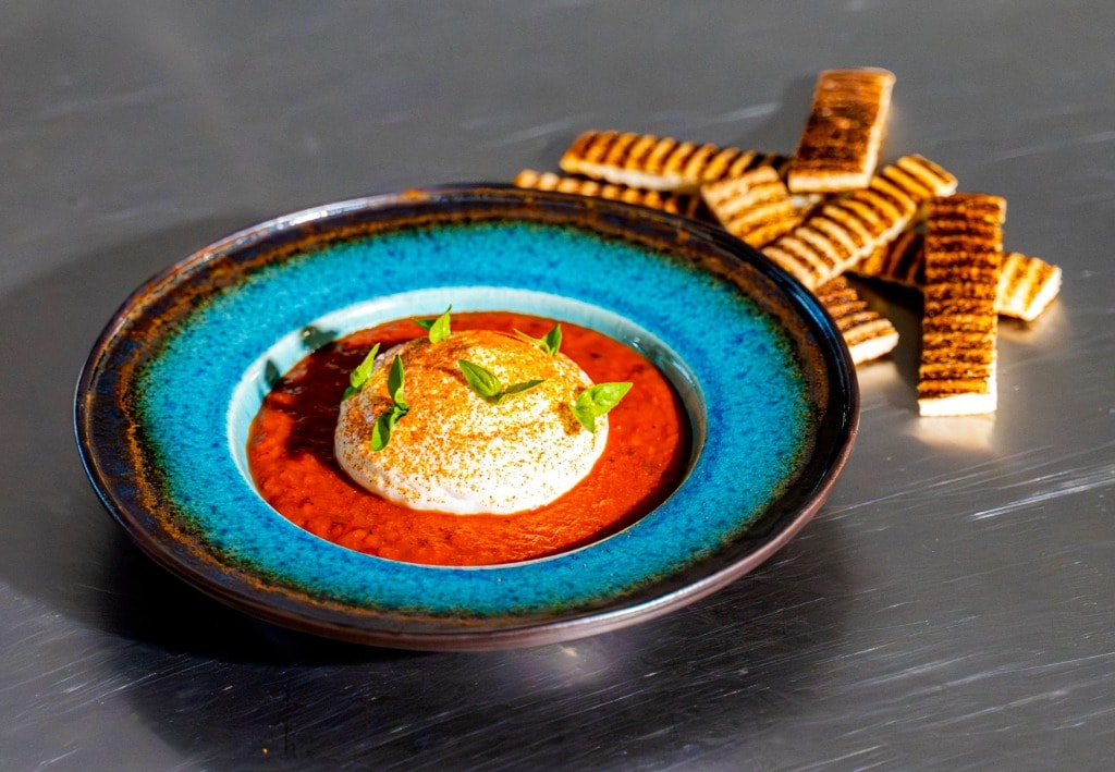 Bränd paprika- och tomatsoppa med basilika och burrataskum